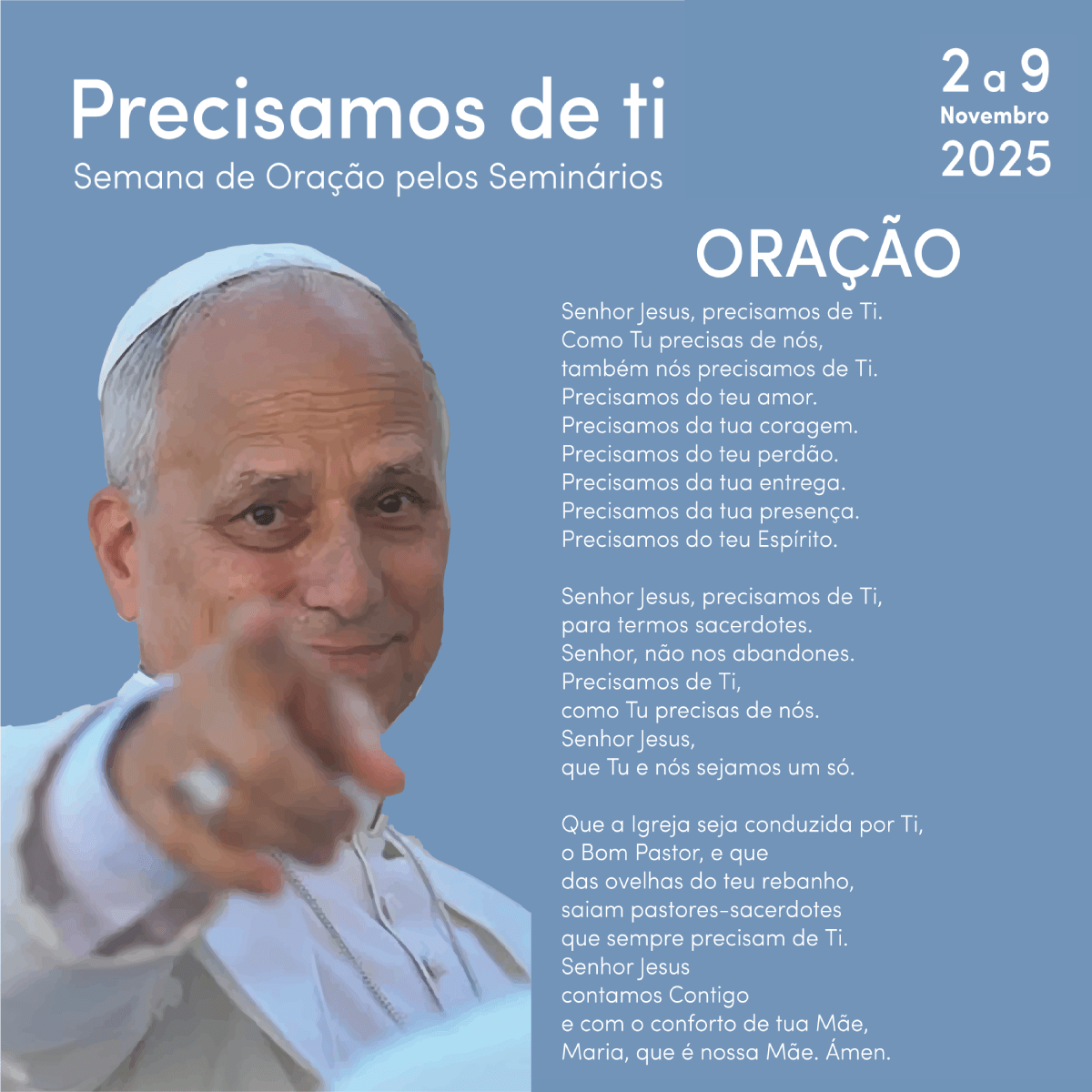 Nesta semana de Oração pelos Seminários Diocesanos, que decorre entre 2 e 9 de novembro, o lema escolhido sai fora dos alvos tradicionais e dos desenhos a que estamos habituados. A começar pela imagem, desta vez é o rosto do Papa Leão XIV, o sucessor de Pedro, que com o dedo indicador aponta para cada um e apela: “Precisamos de ti”. Não é uma proposta feita a partir do pessoal e do singular, mas no plural e em contornos eclesiais.